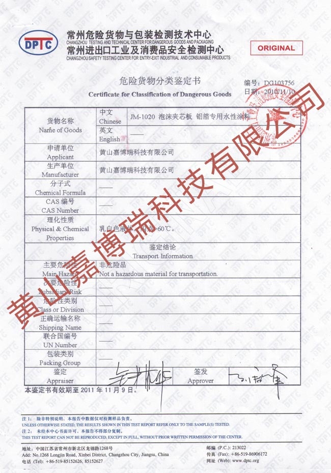 危險貨物分類鑒定書_JM-1020